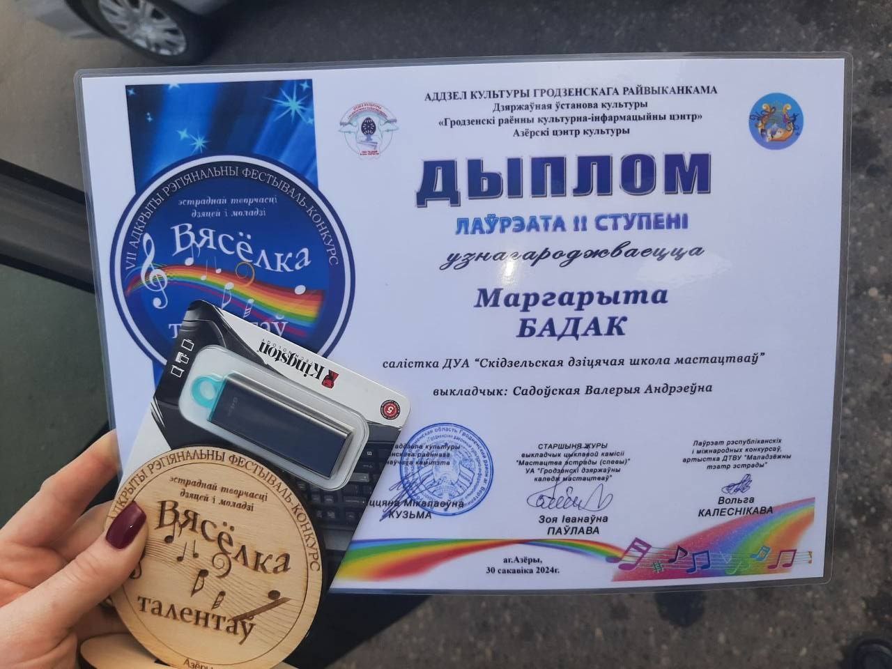 30 марта учащиеся нашей школы искусств класса учителя Валерии Андреевны САДОВСКОЙ приняли участие в VII открытом региональном фестивале-конкурсе эстрадного творчества детей и молодежи «Вясёлка талентаў», который собрал в Озерском центре культуры более сотни солистов и творческих коллективов со всей Гродненской области возрасте от 5 до 31 года. Результат участия наших девочек: Маргарита БОДАК- ЛАУРЕАТ 2 степени, Милана КОЩИЧ - ДИПЛОМАНТ 1 степени, Мила ЧАПЛЮК- ДИПЛОМАНТ 2 степени, Екатерина СИЛЬЧЕНКО - ДИПЛОМАНТ 3 степени. Поздравляем!