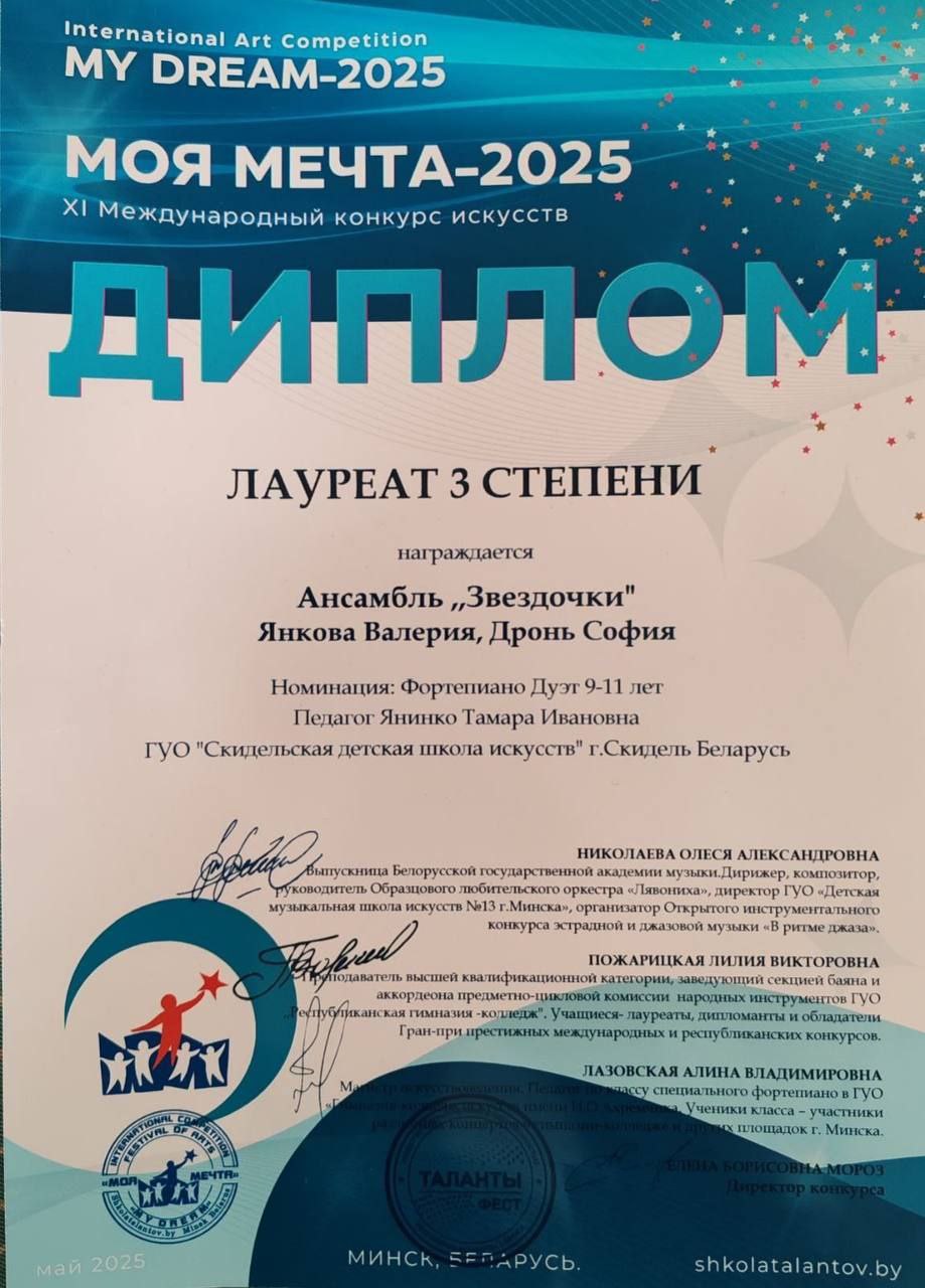 Ансамбль «Звездочки» в составе Софии ДРОНЬ и Валерии ЯНКОВОЙ награждён Дипломом Лауреата III степени.