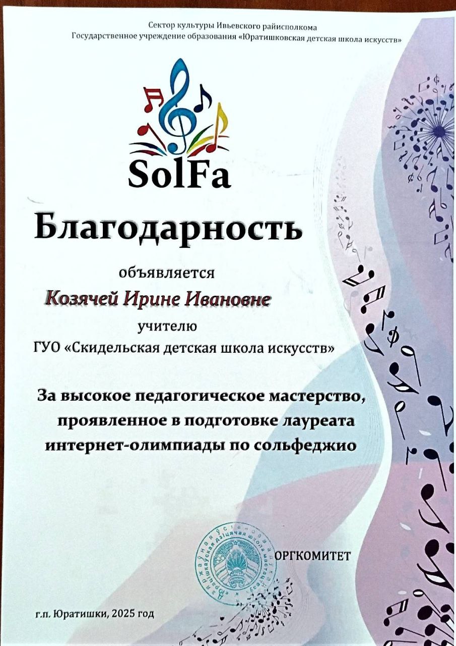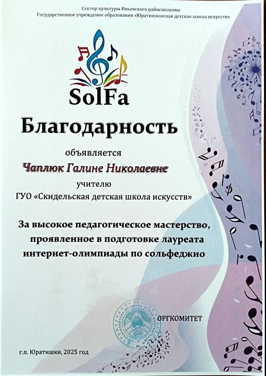 Учителя теоретического отделения подготовили участников региональной интернет-олимпиады по сольфеджио, которая проходила в Юратишковской ДШИ. В результате Иван МАТЮШЕНКО и Максим ГУЩА награждены дипломами Лауреата I степени. Учителя Галина Николаевна ЧАПЛЮК и Ирина Ивановна КОЗЯЧАЯ отмечены благодарностью за профессионализм в подготовке лауреатов конкурса. Учащиеся класса Миланы Денисовны ДОЖИН Анастасия ШАРУБСКАЯ и Сюзанна ПОГОСЯН-Дипломанты 1 степени. Поздравляем!