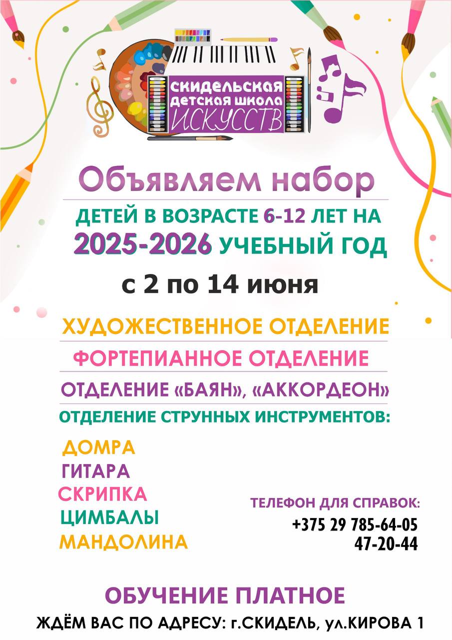 Скидельская детская школа искусств проводит набор на 2025-2026 учебный год.