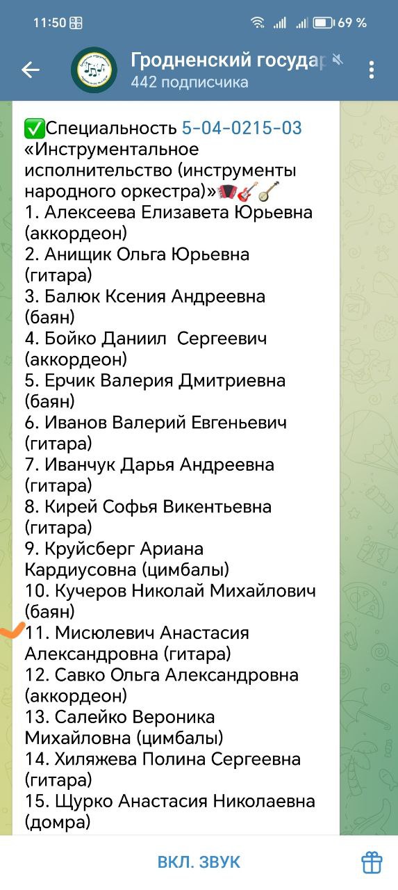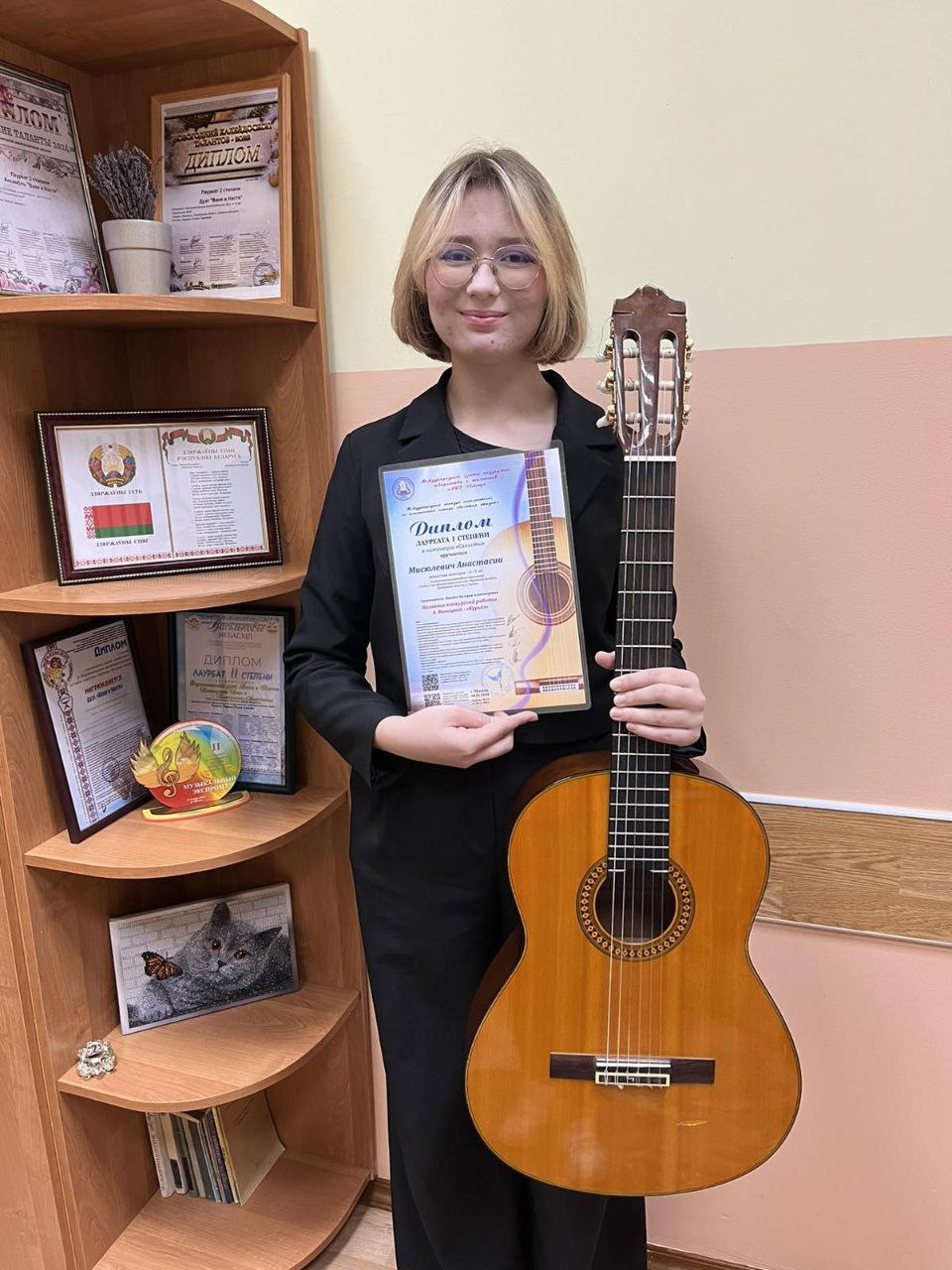 Выпускница нашей школы искусств по специальности "Гитара" Анастасия МИСЮЛЕВИЧ успешно прошла вступительные испытания и зачислена по целевому направлению в УО "Гродненский государственный музыкальный колледж" на отделение "Инструментальное исполнительство". Выражаем благодарность за подготовку учащейся к поступлению учителям Валерии Александровне ВОДЕЙКО, Галине Николаевне ЧАПЛЮК и Виктору Станиславовичу ЖУКУ. Поздравляем Анастасию, желаем ей успехов в учёбе и возвращения по окончанию колледжа в родную школу успешным молодым специалистом.