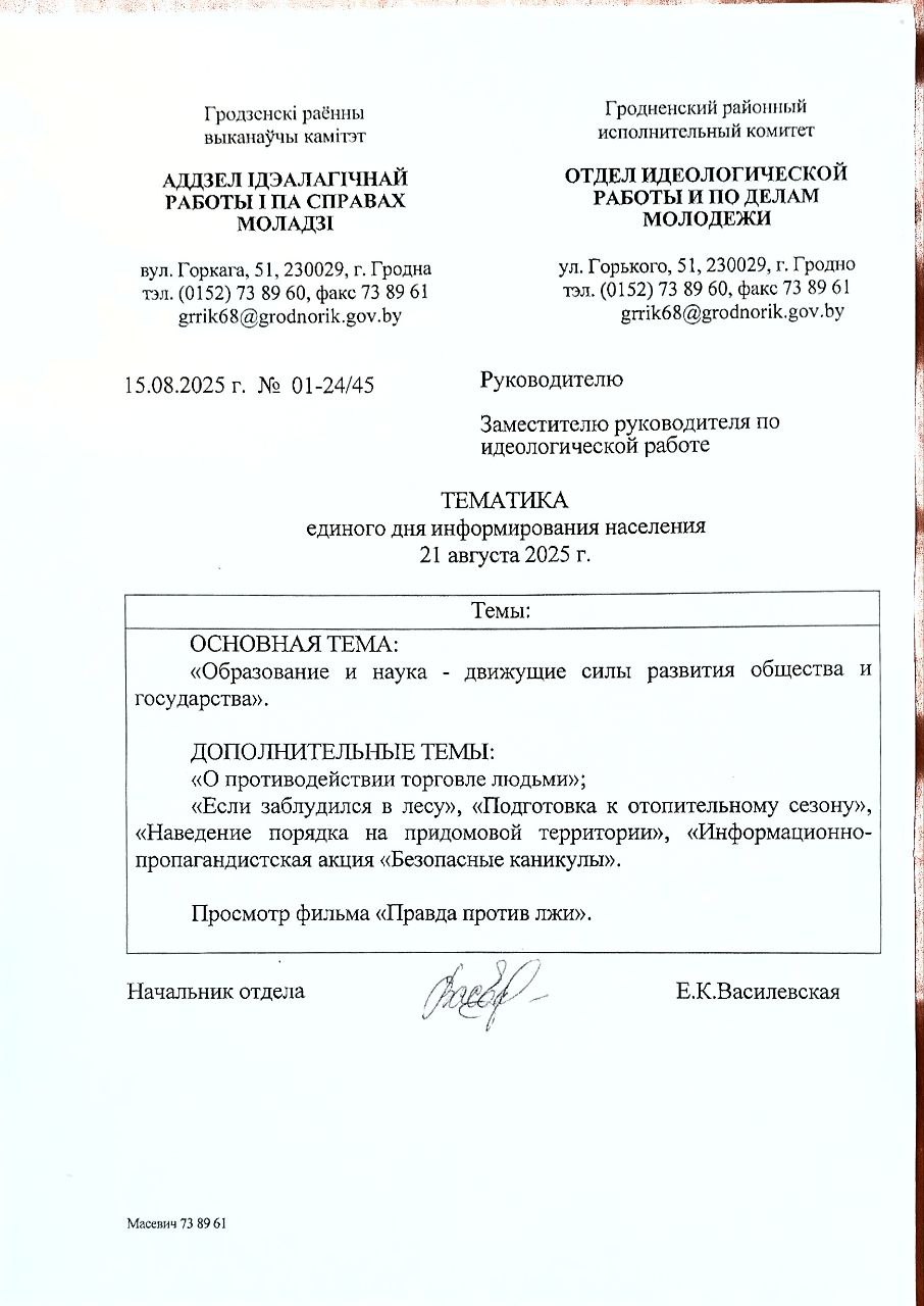21 августа в нашей школе искусств прошел Единый день информирования. Директор школы Валентина Фоминична ПОЛТАВЕЦ ознакомила коллектив с основной тематикой ЕДИ «Образование и наука – движущие силы развития общества и государства». Также для обсуждения были вынесены темы «О противодействии торговле людьми», «Если заблудился в лесу», «Подготовка к отопительному сезону», «Наведение порядка на придомовой территории».Организован просмотр фильма «Правда против лжи».